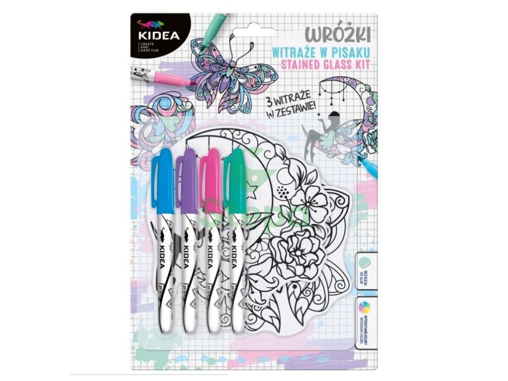 Sada pro tvorbu vitráží s popisovači. Obrázky zůstávají na povrchu díky elektrostatickým silám. Můžete je snadno nalepit a sloupnout, aniž byste poškodili okno nebo stěnu. Umístěním obrázků na okno získáte neobvyklý efekt barevného slunečního světla zaplňujícího místnost. Vitrážové obrázky jsou nejen krásnou dekorací dětského pokoje, ale také jedinečným dárkem pro milovanou osobu.