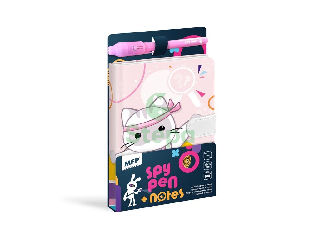 Linkovaný poznámkový blok se zaoblenými rohy. Blok je s motivem roztomilé kočičky v kimonu. Součástí bloku je špionské pero s neviditelným inkoustem, který je čitelný pouze pod UV světlem. Všechny důvěrné informace budou tak skryty. Pero ve fialové barvě je vybaveno malým světýlkem, díky kterému je text viditelný. Blok se uzavírá na magnet.