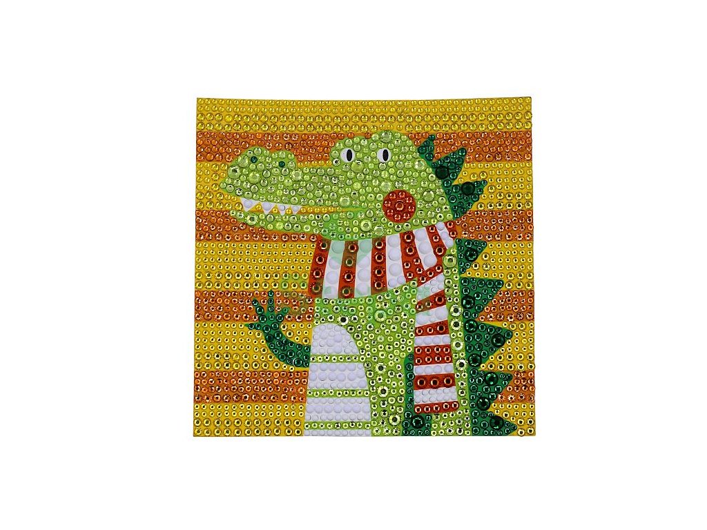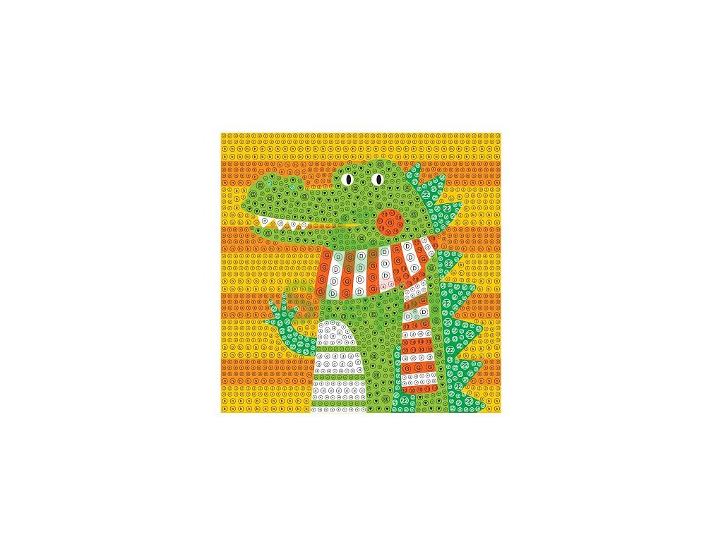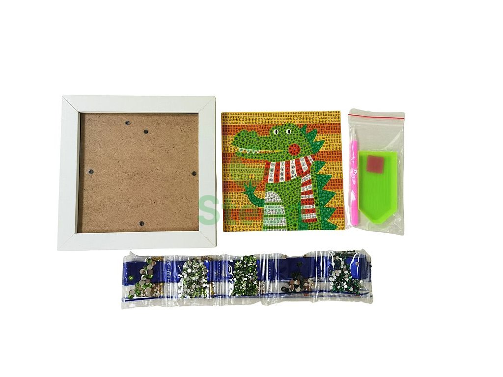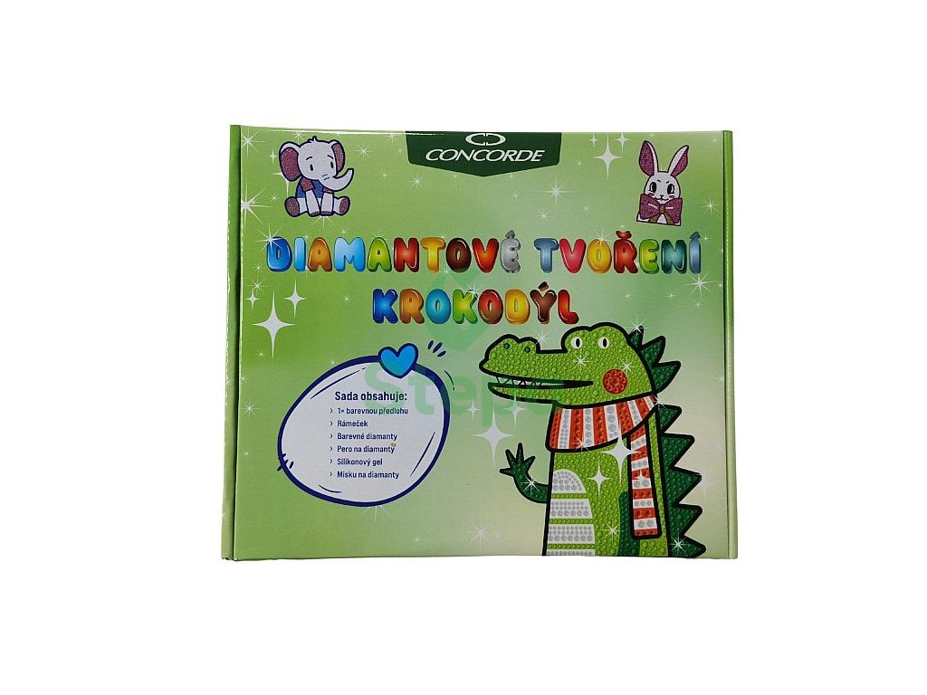 Diamantové tvoření s motivem krokodýla obsahuje barevnou předlohu, bílý rámeček, barevné diamanty, pero na aplikaci diamantu, silikonový gel a misku.