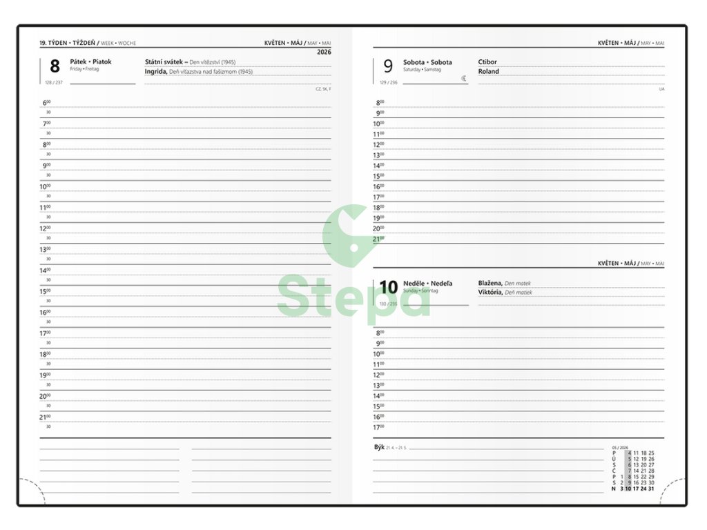 Denní diář formátu A5 je vyráběný z matného hladkého lamina s parciálním lakem, který dodává každému diáři šmrnc. Jedná se nejen o skvělý doplněk, ale také si budete moci efektivněji plánovat Váš čas.