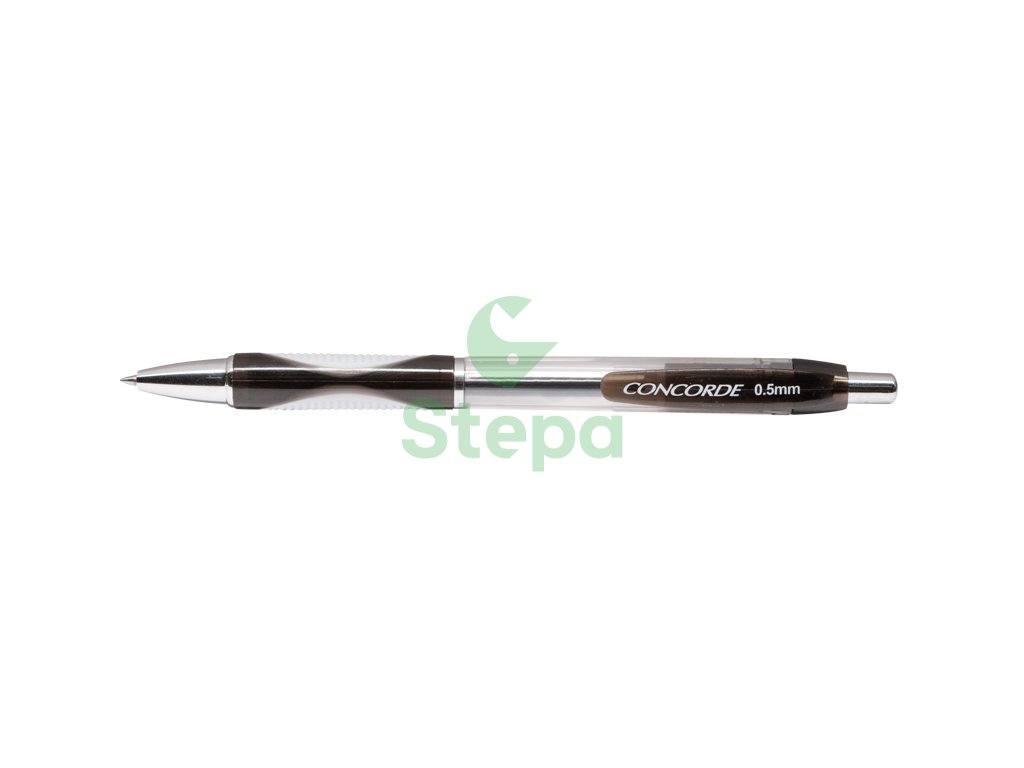 Gelové pero se stiskacím mechanismem a protiskluzovým gumovým úchopem. Jednorázová černá náplň. Průhledné tělo pro optickou kontrolu stavu náplně.