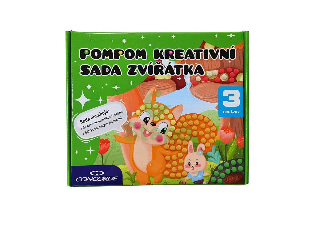 Pompom kreativní sada Zvířátka obsahuje 3 samolepicí obrázky a 565 kusů barevných pompomů.