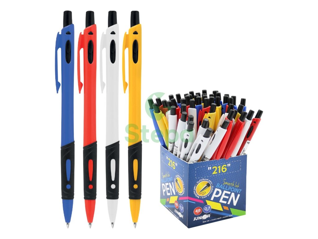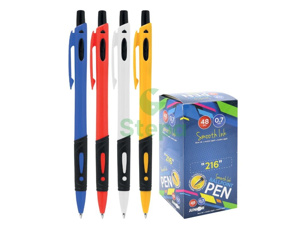 Kuličkové pero s plastovým tělem a ergonomicky tvarovaným gumovým úchopem. Vyměnitelná náplň modré barvy. Dodávané v barvách: modrá, žlutá, červená, bíla.