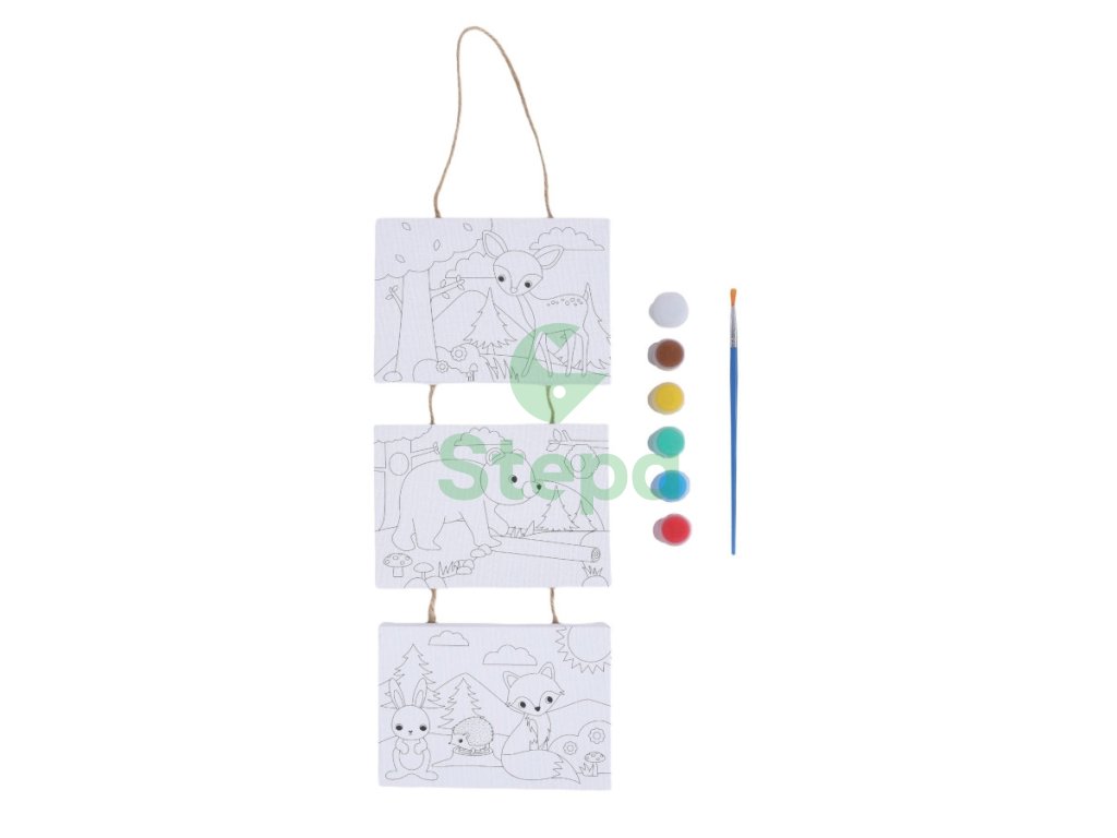 Sada obsahuje 3 malířská závěsná plátna o rozměru 12,7 × 17,8 cm, 6 kelímků s barvou a štětec.