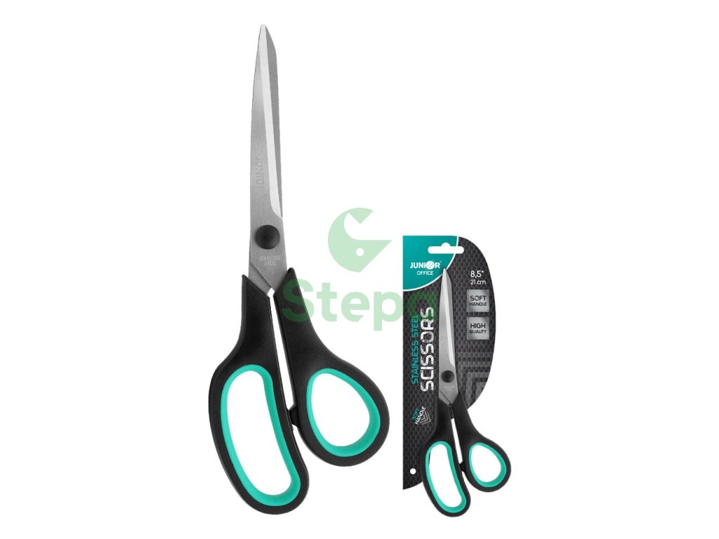 Nůžky s asymetrickou rukojetí z PVC v kombinaci so silikonem poskytující komfortní uchopení.