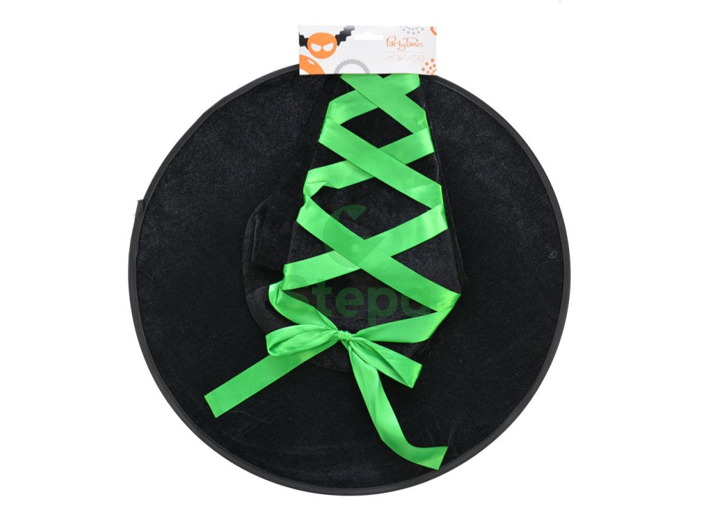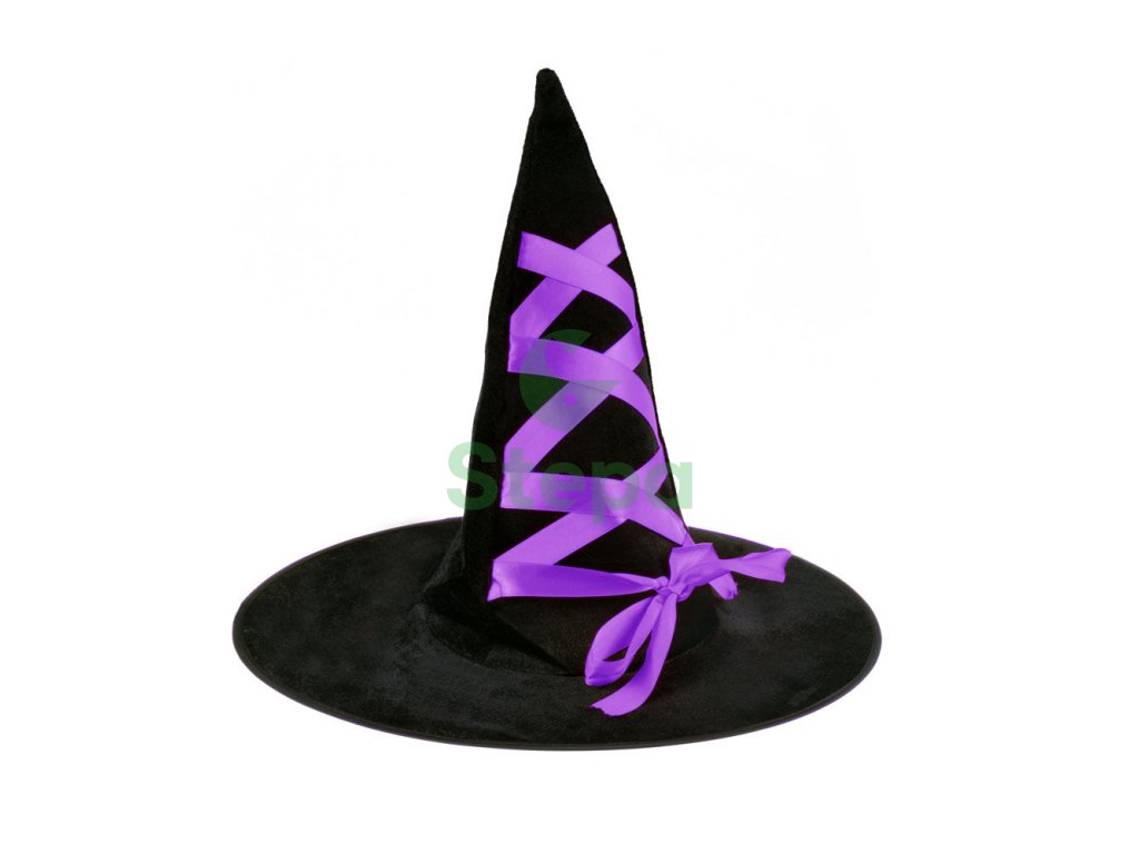 Čarodějnický klobouk se zelenou nebo fialovou mašlí.