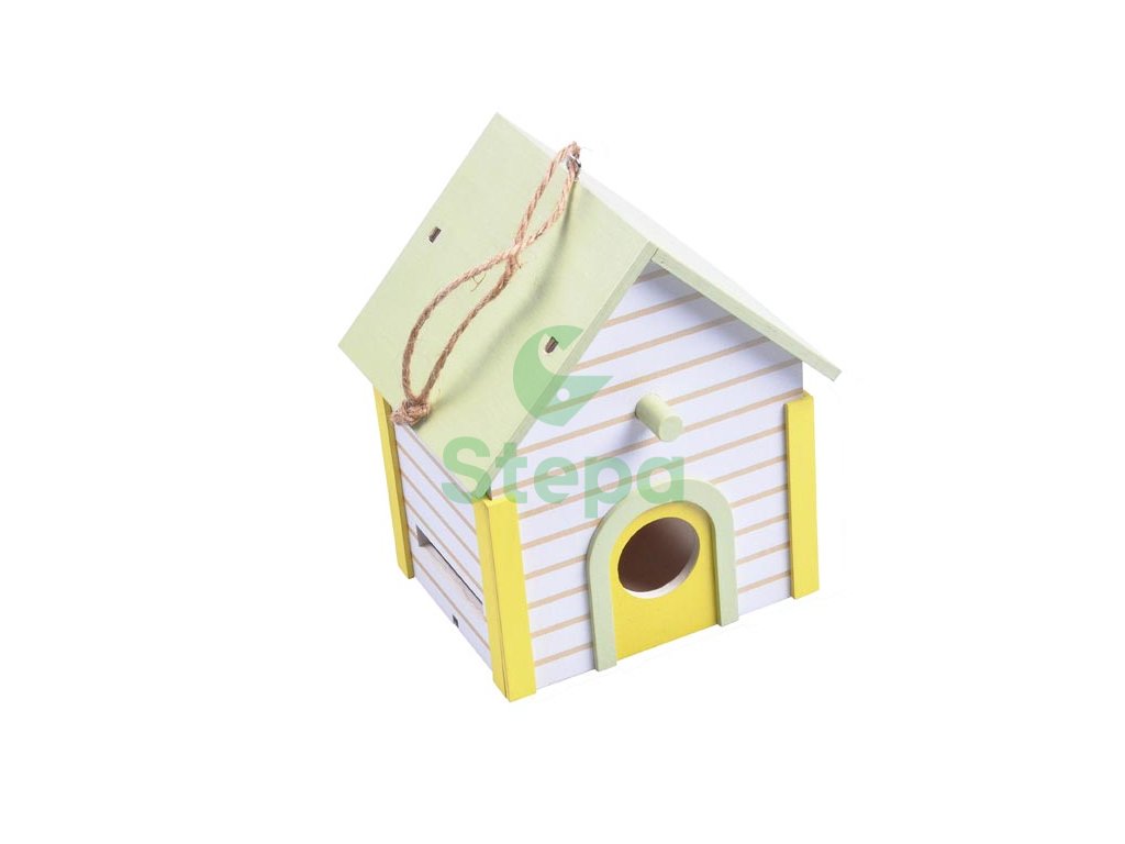 Jarní dekorace ptačí budka ze dřeva na pověšení. Ptačí budka je v bílé barvě se žlutými pruhy, zelenou střechou a bydlem. Je opatřena jutovým provázkem pro snadné zavěšení. Lze ji tedy pověsit nebo může sloužit jako dekorace na postavení.