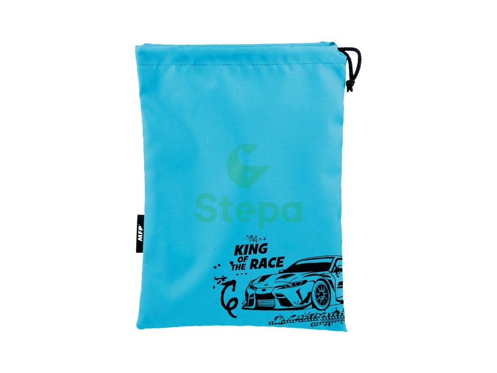 Látkový sáček na přezůvky v modré barvě s motivem závodního auta a nápisem „KING OF THE RACE“