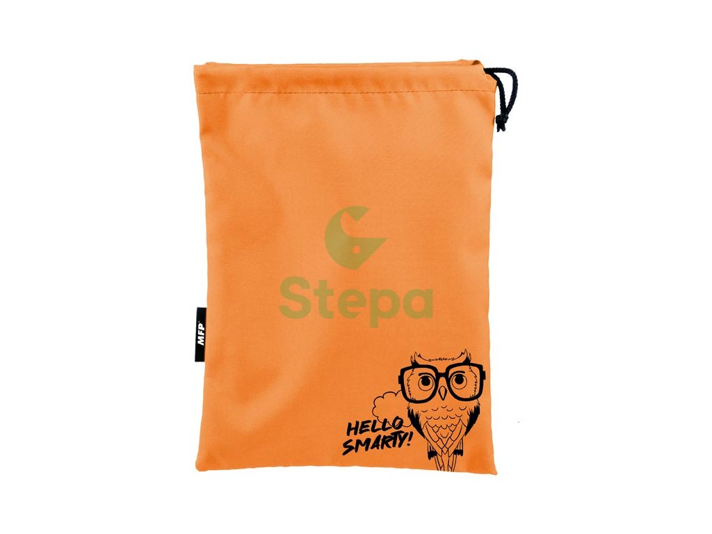 Látkový sáček na přezůvky v oranžové barvě s motivem sovy a nápisem „HELLO SMARTY“