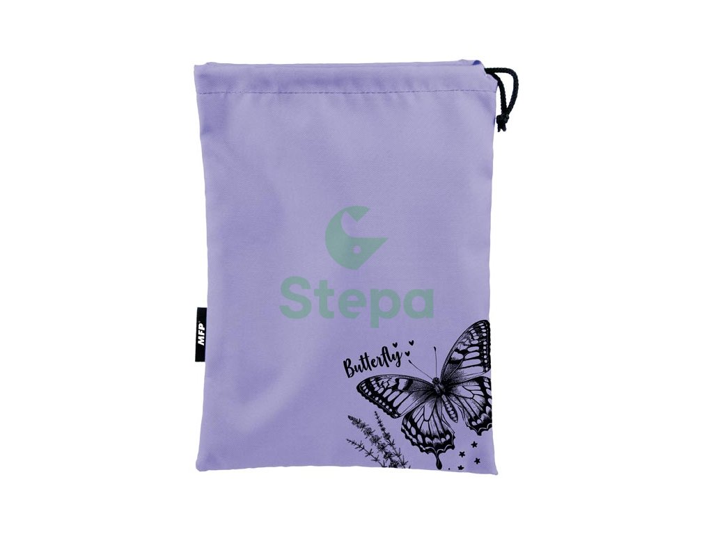 Látkový sáček na přezůvky ve fialové barvě s s roztomilým motivem motýla.