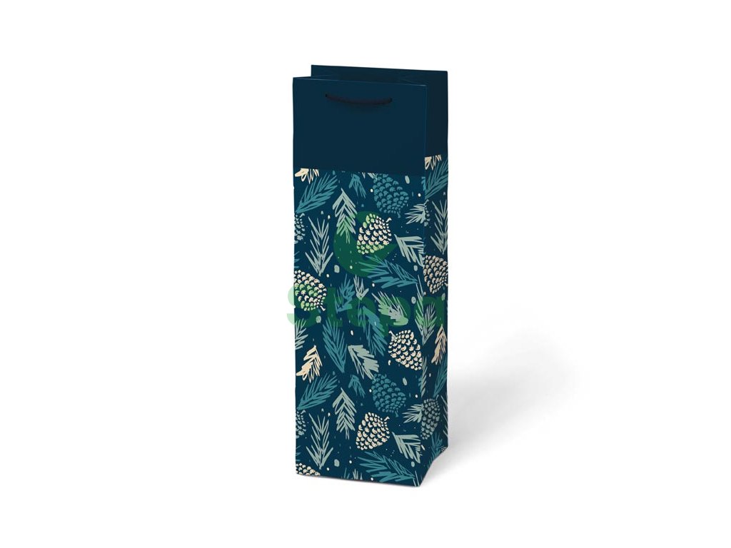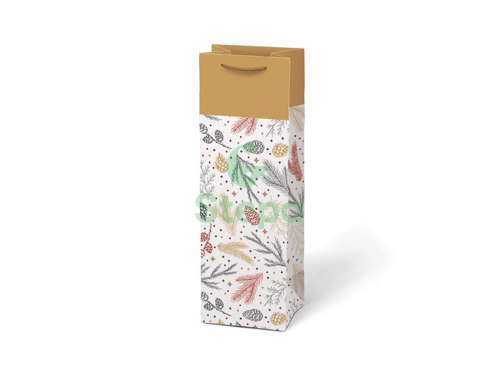 Darujte lahev vína nebo sektu s elegancí. MFP přináší vánoční dárkovou papírovou tašku ve čtyřech elegantních designech s motivy jehličí, větviček a šišek.
