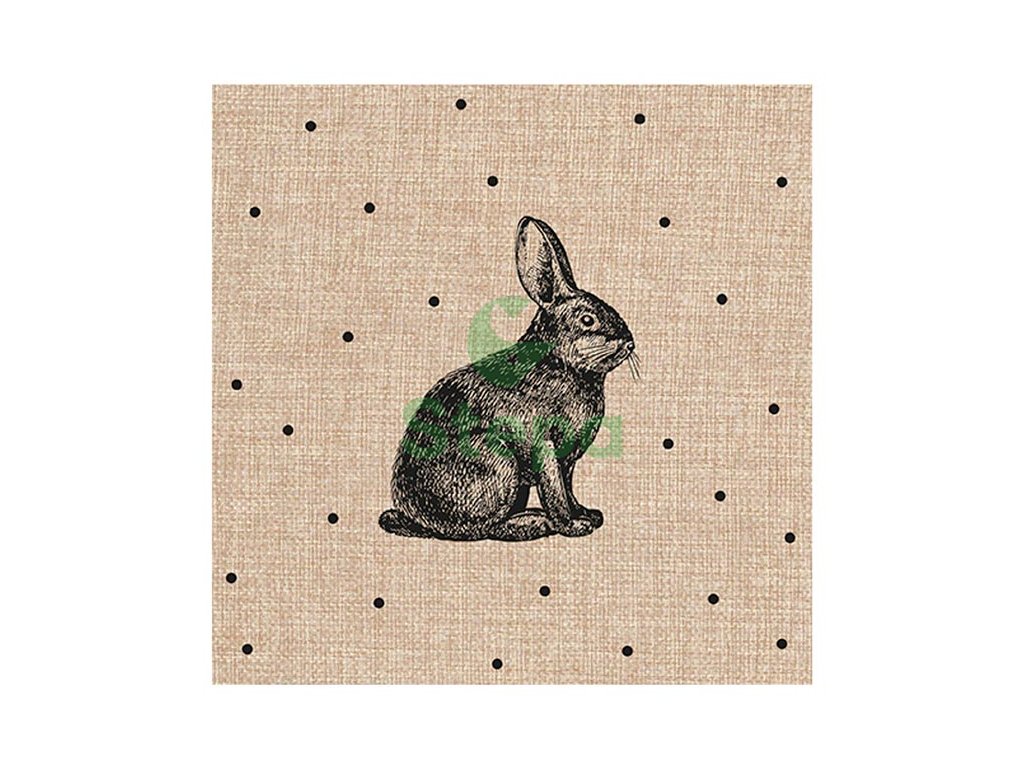 Papírový velikonoční ubrousek. Ubrousky v přírodním stylu s černými puntíky a s motivem zajíčka kresleného tuší vnesou náladu Velikonoc i na váš prostřený stůl v přírodním stylu. Ubrousek je kvalitní z třívrstvého papíru. Vhodný i na ubrouskovou techniku.