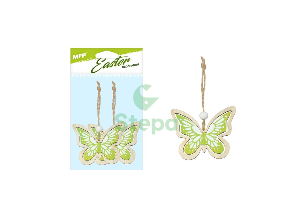 Krásná velikonoční dekorace v designu dřevěného zeleného motýla se závěsem, poslouží jako dekorace do exteriéru nebo na zkrášlení interiéru. Dekorace má provázek na zavěšení.